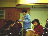 ・基本的にはコンピュータ室はコンピュータを活用する部屋であるが、よりよい発表をすることを考えたら、この写真(コンピュータ室で二人で向き合って発表の練習をしている写真)のように、コンピュータ室でやればいい。コンピュータを使うことばっかりに気がいってしまって、何が大切なのかを忘れてはいけない。
